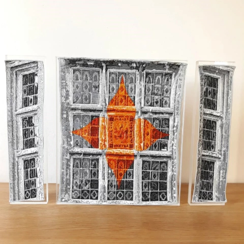 The artwork for this fantastic needlework project is based on the bay windows of National Trust property, Newark Park in Gloucestershire and was made to be included in an exhibition there. As the piece is textured and the customer wanted it to be freestanding rather than enclosed behind glass, 20mm clear acrylic block has been drilled to allow the needlework to be sewn to the front of it for display.